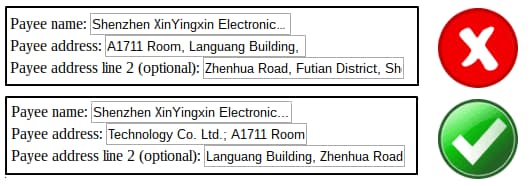 In the first example, the user filled in as much of their payee’s name as could fit in the text field, and then moved on. This is incorrect. In the second example, the user added the rest of the name in the first address text field, followed by the address. This is correct.